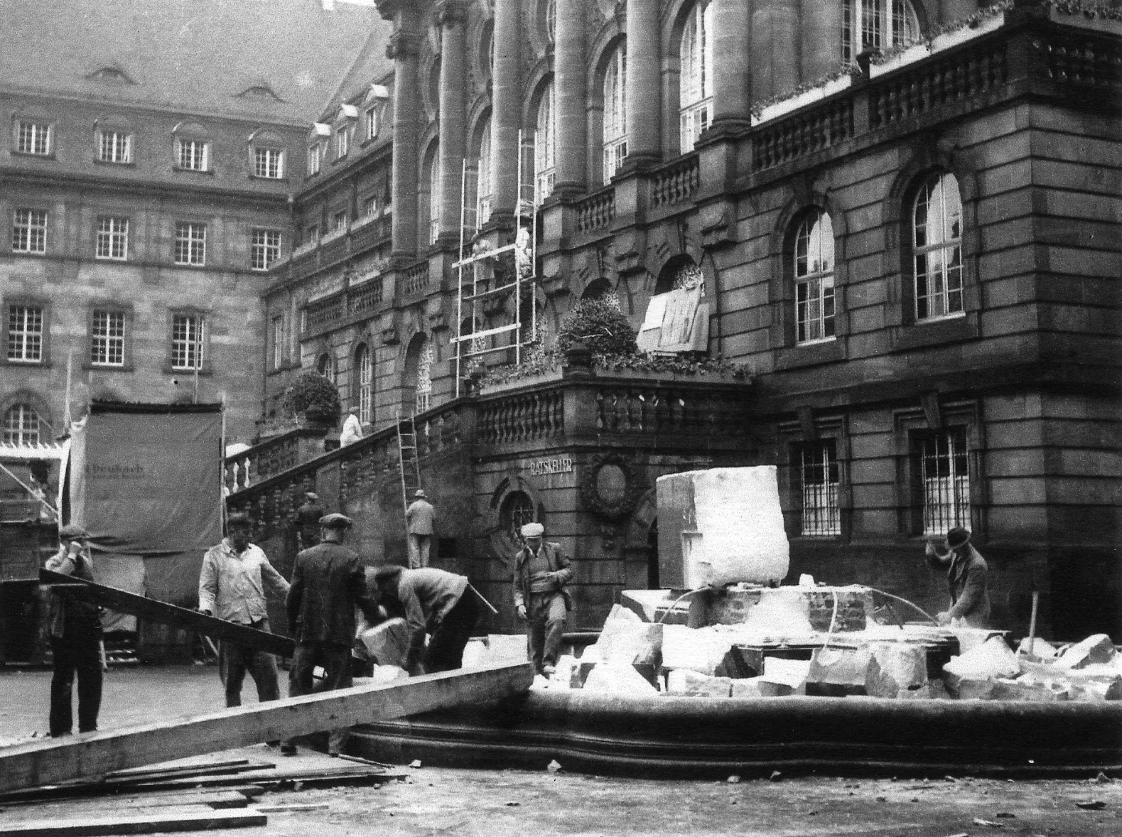 Der 1908 vom jüdischen Kasseler Bürger Sigmund Aschrott (1826-1915) gestiftete Brunnen auf dem Vorplatz des Kasseler Rathauses wurde im April 1939 im Zuge einer antisemitischen Aktion von Nationalsozialisten zerstört und später abgetragen. Zeugnisse jüdischen Lebens und Wirkens in Kassel wurden so aus dem öffentlichen Stadtraum entfernt.