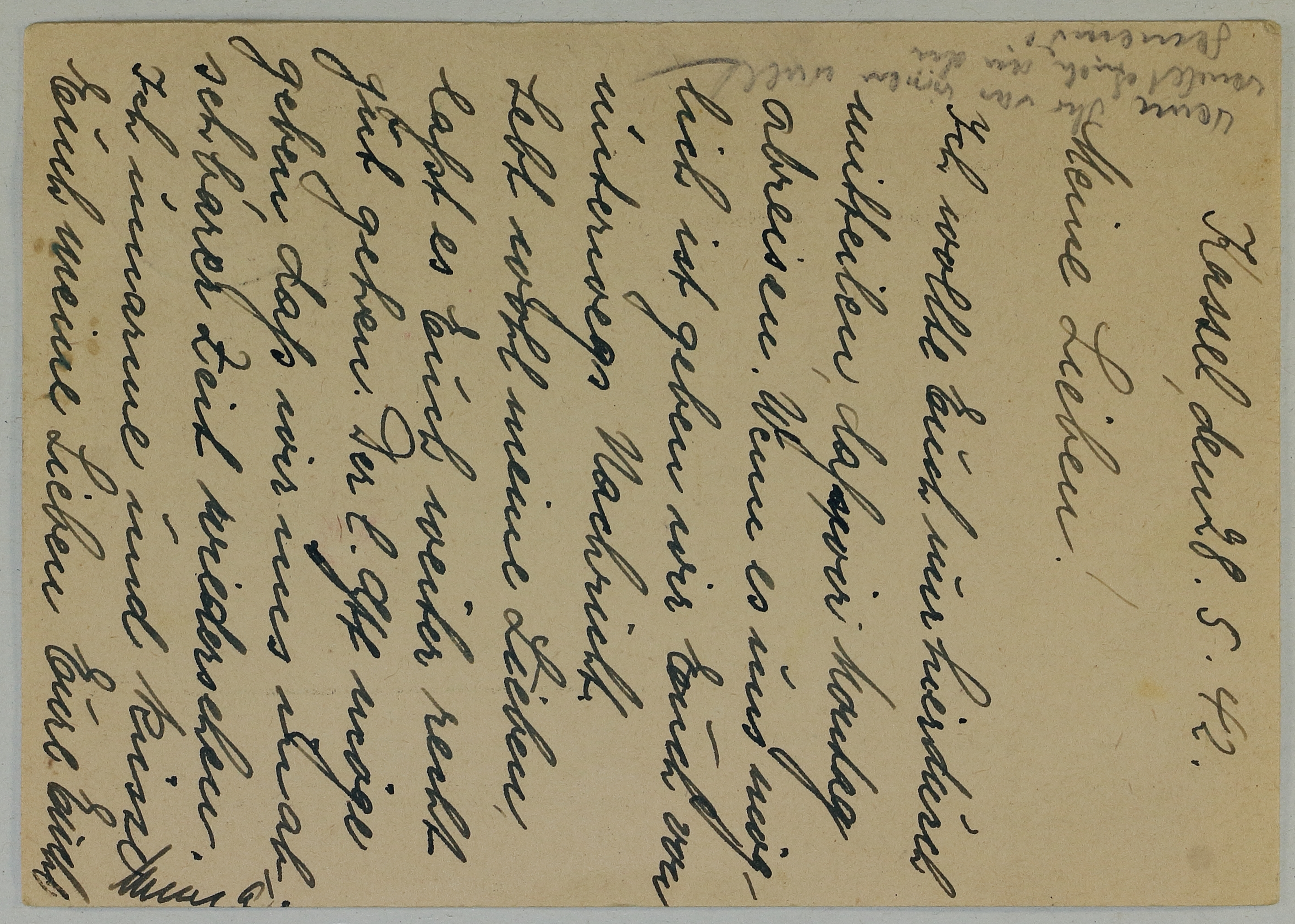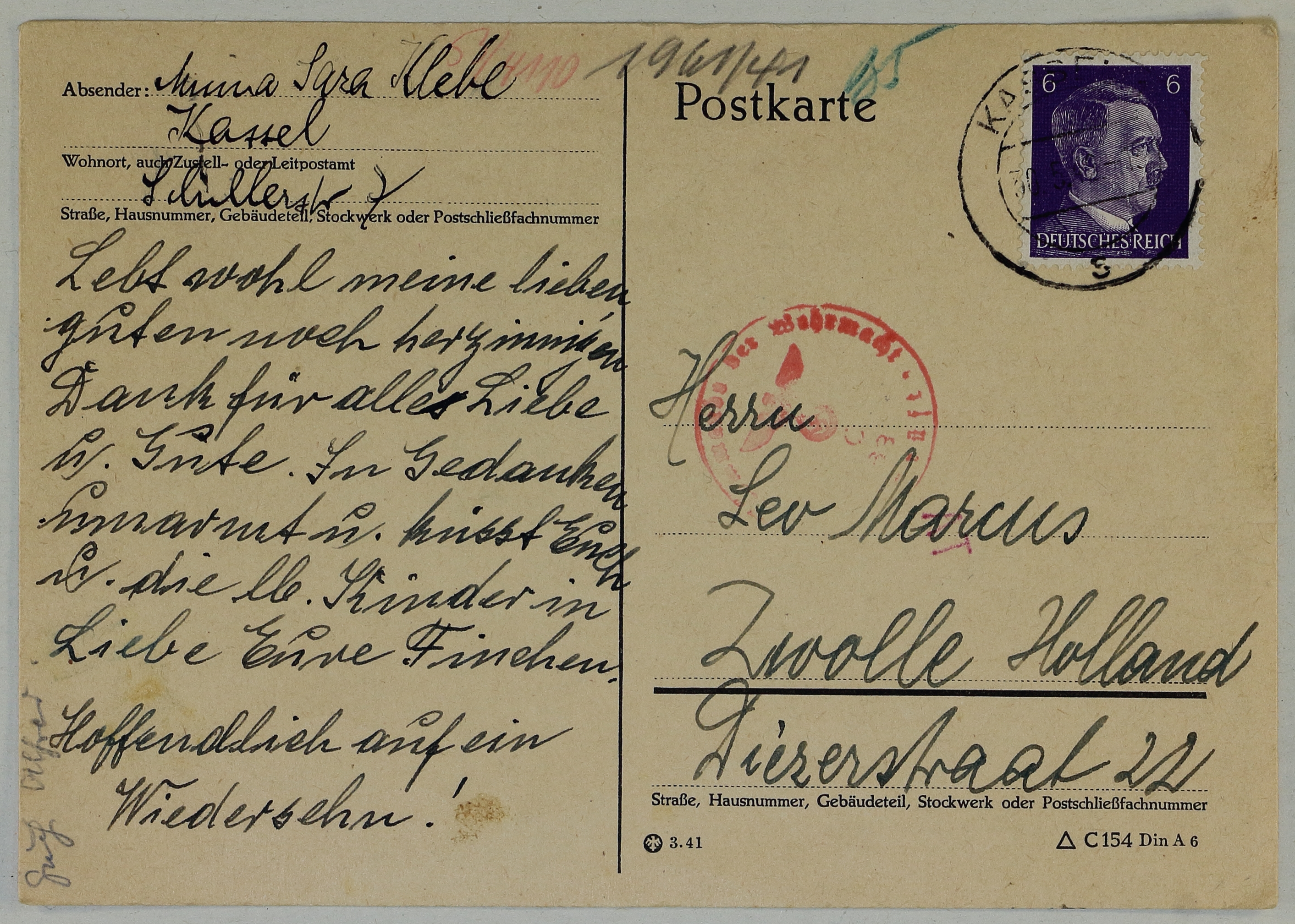 Die jüdische Kasseler Bürgerin Wilhelmine Klebe schrieb am 28. Mai 1942, vier Tage vor ihrer Deportation in das Vernichtungslager Sobibor, eine Karte aus Kassel an Verwandte in den Niederlanden.
